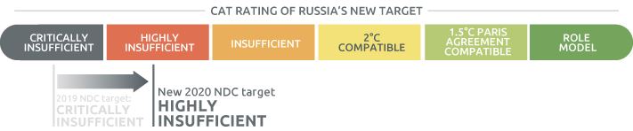 Russia formally submitted a new 2030 emissions target to the UNFCCC in November 2020. The update did not strengthen the country’s 2030 target in any real sense, as it is higher than Russia’s own 2030 emissions projections under current policies. The CAT rates the new NDC target as ‘Highly Insufficient’.