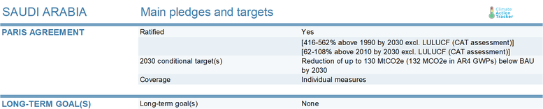 Saudi Arabia’s 2030 climate commitment is highly unclear, due to a lack of data availability, including the absence of any national emissions projections and the fact that Saudi Arabia has not published the baseline corresponding to its Paris Agreement target. The CAT rates Saudi Arabia’s climate commitment “Critically Insufficient” based on available information.