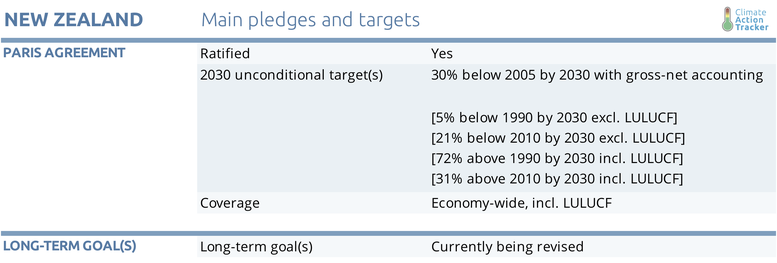 New Zealand’s Paris Agreement-NDC target—ofa 30% reduction from 2005 levels by 2030— is ratedas “Insufficient,” meaning that it is not consistent with holding warming to below 2°C, let alone limiting it to 1.5°C as required under the Paris Agreement, and is instead consistent with warming between 2°C and 3°C.
