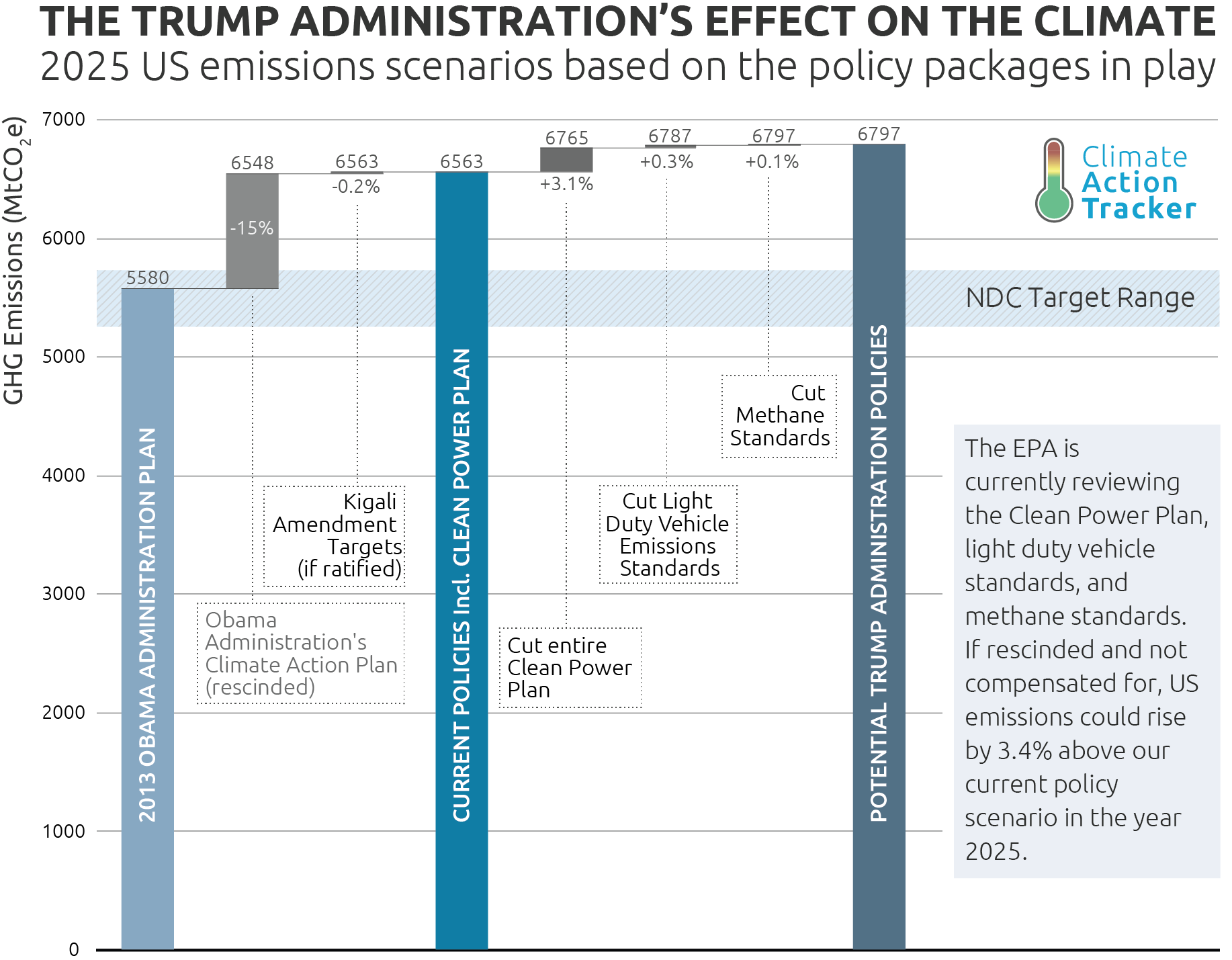 It remains unclear whether the US will stay in the Paris Agreement; if it does, it appears clear that the Trump Administration will seek to reduce the level of ambition of the US NDC. This would contradict the spirit and the need of the Paris Agreement to increase ambition. If the CAT were to rate the current policies of the Trump Administration as an NDC, it would move it from “Medium” to “Inadequate” on its rating scale.