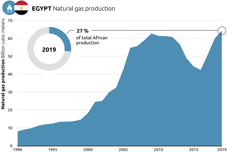 In 2019, Egypt’s fossil gas production reached a high of 64 bcm, representing over a fourth of total gas production in Africa. Egypt has significantly ramped up its fossil gas production in the past few years, after a steep decline that followed the Egyptian revolution in 2011.